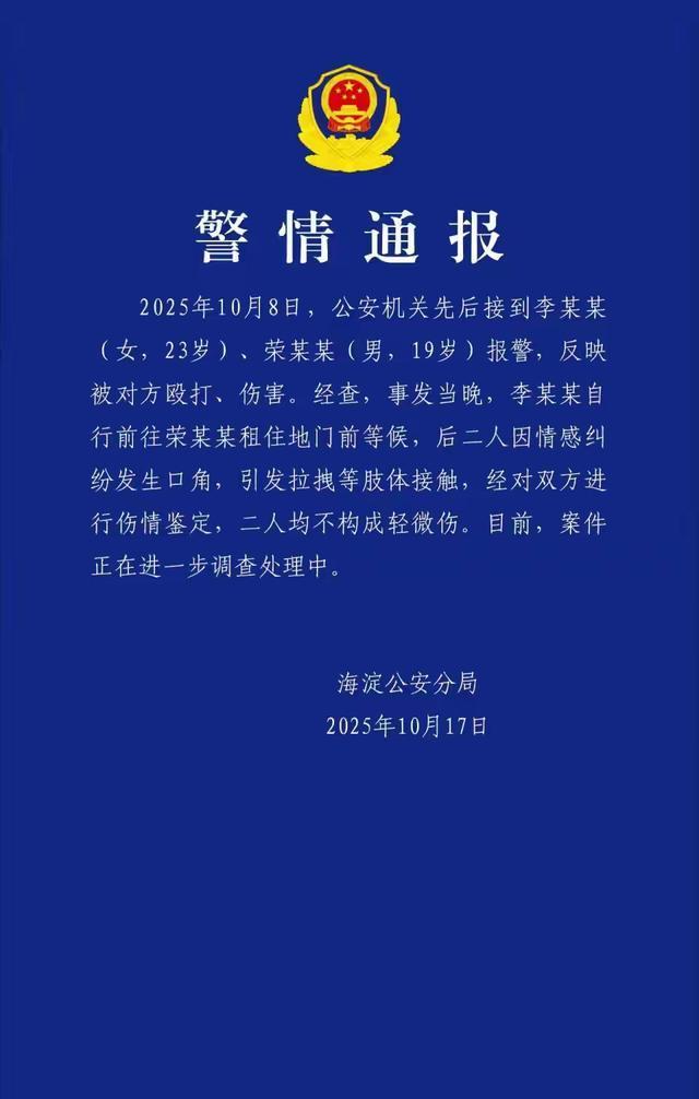 10月中旬,警方发了通报,说荣梓杉和李禹熹因为感情闹矛盾,动了手,两人都是中戏的学生,一个大一,一个大三,荣梓杉19岁,小时候演过《隐秘的角落》,现在是新生,李禹熹23岁,比他大四岁,事情闹到报警,学校也说,要是真谈恋爱,就得严肃处理,他俩的学业和工作都悬了。