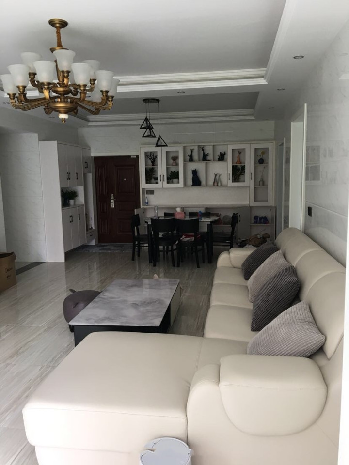 客餐厅的天花板各自做了简单的吊顶装饰,餐厅的三盏简单的垂灯,客厅则是吊灯,不过这款吊灯着实不推荐,灯罩是倒着的,以后要清洁是真的很麻烦了。