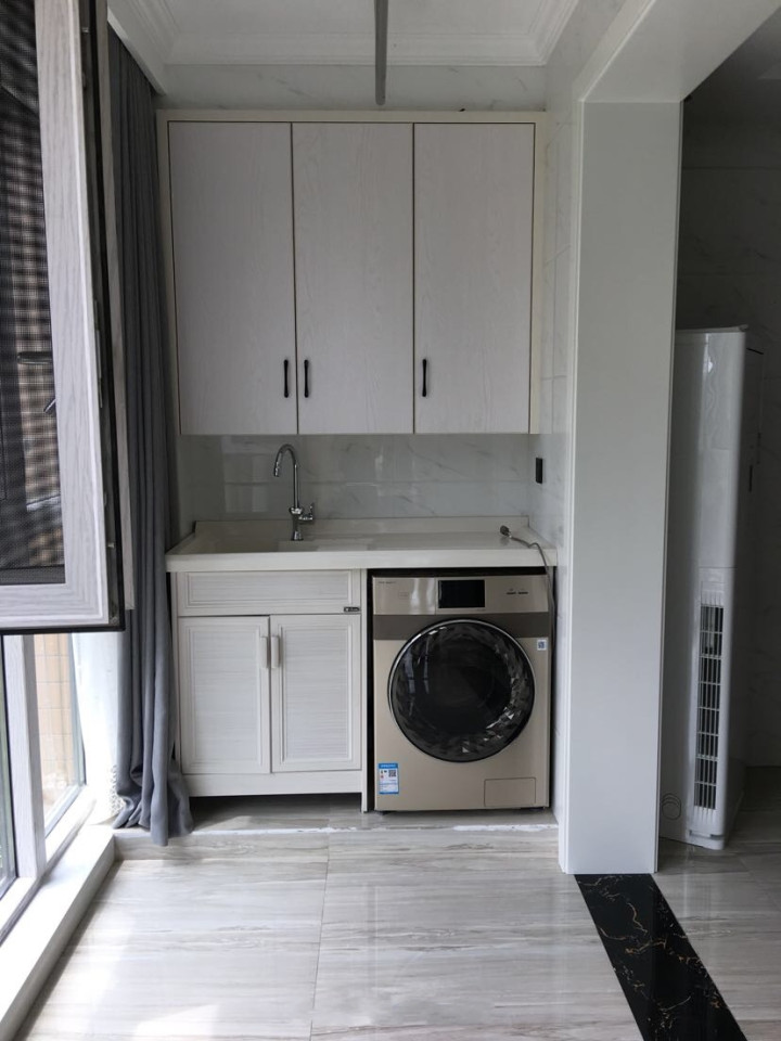 阳台,整个走廊是贯穿的,空间非常大,而且做了封包的设计,作为晾晒区就很宽敞了,而且一端做了定制的洗衣台以及吊柜,阳台的采光非常好,虽然做了封包,但是采光和通风性能都很好,特别是这边是向阳的,所以作为衣服的晾晒区就很实用了。
