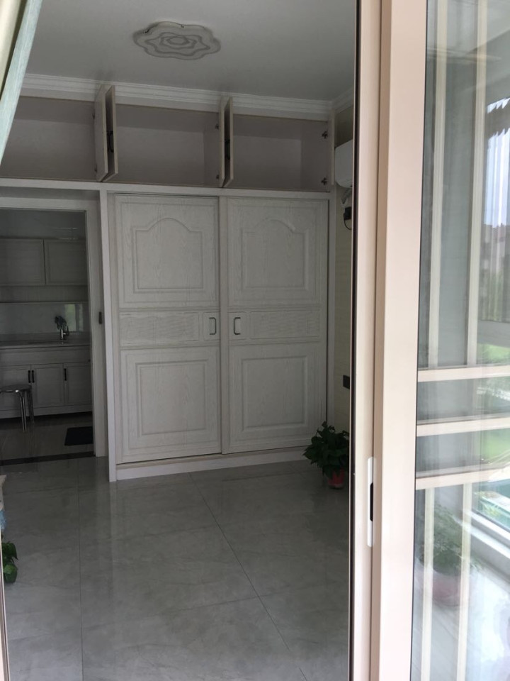 而阳台的另外一端就是一面落地窗,可以看到小区内的风景,还是蛮不错的,你们觉得呢?